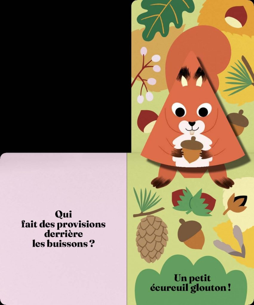 Cet adorable livre-pop-up propose à vos tout p’tits loups une découverte ludique des animaux de la forêt… Car chaque petit animal (écureuil, raton laveur, renard, lynx, hibou, sanglier, loup), annoncé sous la forme d’une petite comptine rigolote, surgira en 3D lorsqu’ils soulèveront les flaps où ils sont bien cachés ! Cet album illustré de couleurs chatoyantes régalera les yeux de vos bouts de chou !