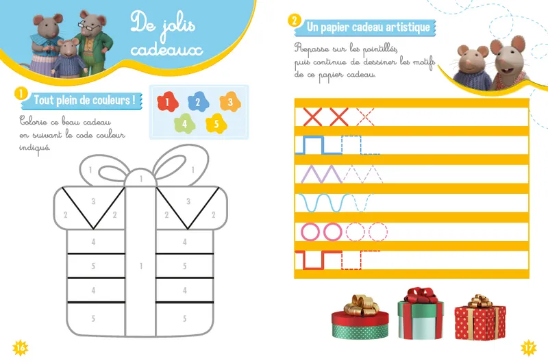 Ces cahiers joyeusement illustrés permettront à vos p’tits loups d’acquérir ou de réviser les bases de la petite à la grande section de maternelle (deux autres cahiers sont diponibles pour les 3/4 ans et les 5/6 ans). Sous la forme de petits exercices, ils pourront ainsi s’exercer à l’écriture et découvrir et reconnaître chiffres, formes et lettres, sous l’oeil bienveillant de deux adorables petites souris ! De plus, grâce aux nombreux jeux proposés (coloriage, dessin, points reliés, memory, labyrinthes…) ils pourront affiner leur sens de l’observation, leur dextérité et leur esprit logique, de la manière la plus ludique qui soit… « Travailler » deviendra un plaisir !