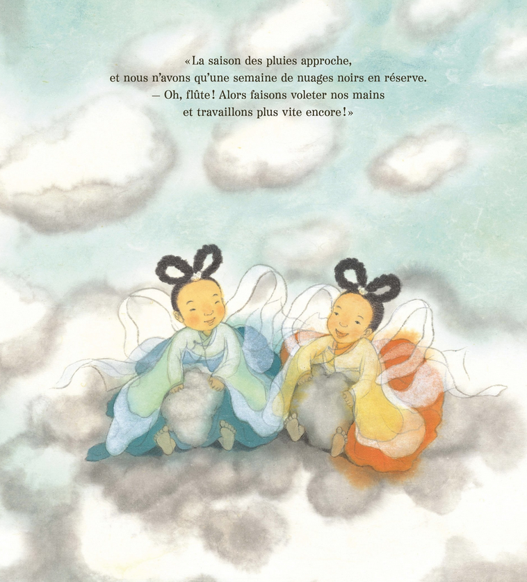 Tout là-haut dans le ciel, au coeur du monde céleste, des petites fées filent les nuages afin de préparer la prochaine saison des pluies. Un travail monotone qui ennuie fortement deux de ces petites créatures qui rêvent d’explorer le vaste Monde ! Vite, elles retirent leurs robes ailées qui les entravent… Mais sans leurs petites ailes, elles dégringolent d’un nuage et sont sauvées in extremis par leurs amies ! Penaudes, les deux petites fées indociles sont alors convoquées devant la vieille fée qui, au lieu de les punir, leur fait confectionner des robes ailées beaucoup plus légères qui leur permettront de mieux se mouvoir dans le ciel. Elle leur confie ensuite à chacune un coffret contenant, pour l’un, deux petites lances d’argent et pour l’autre, un tambour accompagné d’une baguette. Munies de leur cadeau, nos deux petites fées partent enfin à la découverte du Monde et s’émerveillent chaque jour de sa beauté. Un jour, alors que de sombres nuages obscurcissaient le ciel, la première petite fée lança une de ses petites lances qui, en tombant, s’illumina en devenant gigantesque. La seconde petite fée se mit à alors à jouer du tambour, produisant illico un bruit tonitruant… La foudre et le tonnerre étaient nés ! Ce conte malicieux (écrit par Han Kang, lauréate du prix Nobel de littérature) est sublimée par les illustrations de Jin Tae Ram qui met en lumière toute la poésie qui en émane avec une extrême délicatesse. Nul doute qu’après la lecture de cet ouvrage, vos p’tits loups, au lieu de craindre les orages, s’empresseront d’envoyer de tendres pensées en direction de ces intrépides petites fées ! A partir de 4 ans.