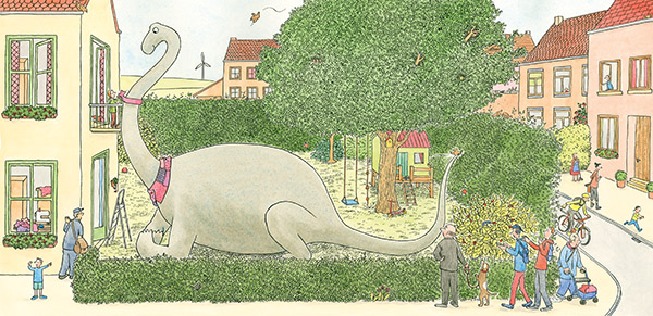 Ce dimanche, visite du musée en famille ! Et pas n’importe quel musée… Celui qui expose des squelettes de dinosaures ! Bien sûr, il y a très, très longtemps qu’ils ont tous disparu de la surface de la Terre… Mais imaginez si une de ces énormes bestioles avait survécu ? Pour les enfants, pas de doute ! Ils s’en feraient un ami, lui donneraient un affectueux surnom, l’emmèneraient à l’école pour épater les copains, ou l’habilleraient comme une poupée géante ! Maman imagine déjà qu’elle ferait de longues balades, perchée sur son cou et bercée au gré de ses pas… Quant à papa, plus pragmatique, il verrait en lui un allié précieux pour déboucher les gouttières ou tailler la haie… Plus besoin d’échelle pour y accéder ! Bon, il faudrait demander de l’aide aux pompiers pour lui faire sa toilette à la lance à incendie, et solliciter le fermier pour qu’il accueille chaque nuit leur grosse bête bien au chaud dans sa grange… Mais rien n’est impossible quand on rêve ! Et vous, les p’tits loups, de quoi rêveriez-vous si vous aviez un dinosaure de compagnie ? Un album empreint d’humour qui fera vagabonder la fertile imagination de vos enfants, tout en aiguisant leur sens de l’observation… Car un chouette jeu de « cherche et trouve » leur est proposé au coeur de ses foisonnantes illustrations ! A partir de 3 ans.