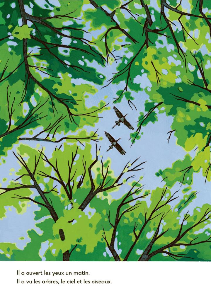 Un petit bonhomme, aussi curieux qu’innocent, découvre et s’émerveille de tout ce qui l’entoure. Tous ses sens sont en éveil face à la magnificence de la nature : la forêt et ses arbres immenses qui s’élancent vers le ciel, entre ombres et lumière… Le bruissement d’un ruisseau et les jeux de reflets qui s’animent comme magie… La fraîcheur qui se dégage de la terre et de l’herbe humide sous ses pieds nus… Le petit être explore, s’étonne, parfois s’inquiète, mais savoure toujours avec gourmandise cet environnement jusqu’alors inconnu… Par la grâce d’un texte poétique d’une extrême douceur qui accompagne en totale harmonie des illustrations d’une beauté à couper le souffle, « Premier jour » offre à nos p’tits loups un pur moment de plénitude et de contemplation… Un gros coup de coeur pour cet album qui est une véritable splendeur ! A partir de 3 ans.