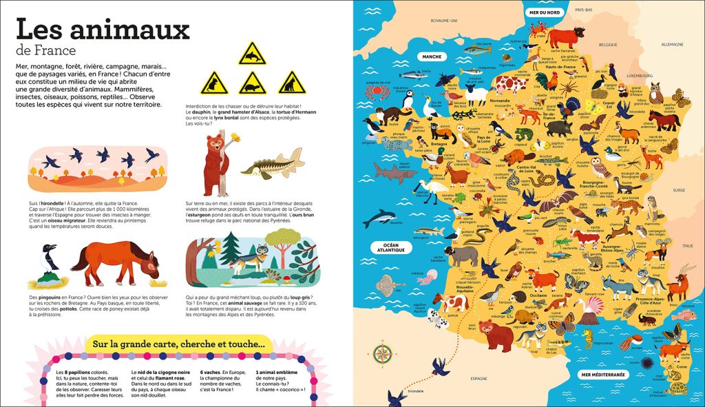 Ce bel et grand album propose à nos p’tits loups de découvrir la France et les spécificités de chacune de ses régions, en mots et en images… Mais aussi par le toucher grâce à une centaine de surfaces tactiles qui leur permettront une exploration ludique sur le sujet ! Il se décline en douze chapitres (la place de la France dans le Monde, océans et montagnes, les animaux de France, les spécialités culinaires, les régions et les départements, les DR-COM, l’océan Indien et l’océan Pacifique…) proposant chacun une partie documentaire illustrée de cartes joyeusement colorées, ainsi qu’un jeu de cherche et trouve ! Un album original et de belle qualité pour tout savoir sur notre pays ! A partir de 4 ans.
