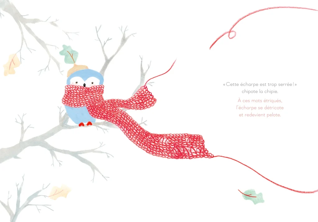 Aujourd’hui, au cours de sa cueillette quotidienne, Bredouille a trouvé une jolie pelote de laine. Et voilà notre petit bonhomme qui tricote avec enthousiasme une chaussette qu’il est fier de faire admirer à ses amis ! Mais la grenouille se moque de lui… Une seule chaussette ne sert à rien ! Dépité, Bredouille détricote son ouvrage… Et cette pelote va vivre bien des aventures en prenant tout plein de formes différentes et redevenant pelote à chaque fois que sa nouvelle forme déçoit ! En cocon douillet pour la chenille qui n’aime pas sa couleur, en écharpe jugée trop serrée par le hibou, en tapis trop humide au goût des petits hérissons, en coussin pas assez doux pour les chatons… Bredouille finit par regretter sa chaussette face à l’ingratitude de ses amis ! En plus, à force de tirer dans tous les sens, sa pelote est désormais toute emmêlée… Et si elle décidait elle-même de son aspect final ? Une pelote magique, un gentil petit bonhomme qui fait preuve d’une belle dose de persévérance… Et une bien jolie histoire qui déroule avec douceur et poésie l’importance de ne jamais se décourager ! Un album aussi tendre que craquant. A partir de 3 ans.
