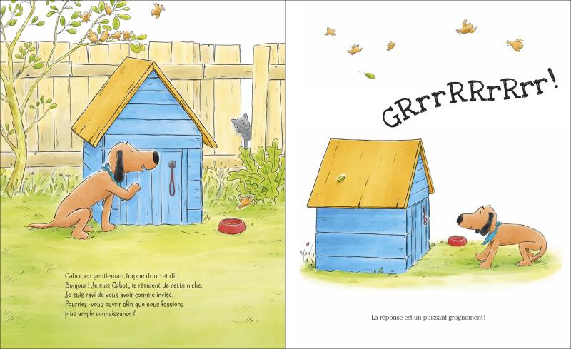 Cabot est un chien résolument généreux qui n’hésite pas une seconde à partager sa gamelle avec les chiens errants et qui ne rouspète jamais quand le chat squatte son coussin. Mais le jour où un intrus peu aimable s’installe dans sa niche sans sa permission, il n’est vraiment pas content… Il faut dire que son doudou adoré est resté à l’intérieur et qu’il voudrait bien le récupérer ! Il veut bien être gentil, mais il y a des limites… Un doudou, c’est sacré ! Après avoir usé, en vain, de bien des ruses, Cabot trouve enfin l’idée imparable pour récupérer son bien… Avec ses illustrations craquantes en diable et sa chute aussi drôle qu’inattendue, cet album fait la part belle à l’humour et à la tendresse ! A partir de 3 ans.