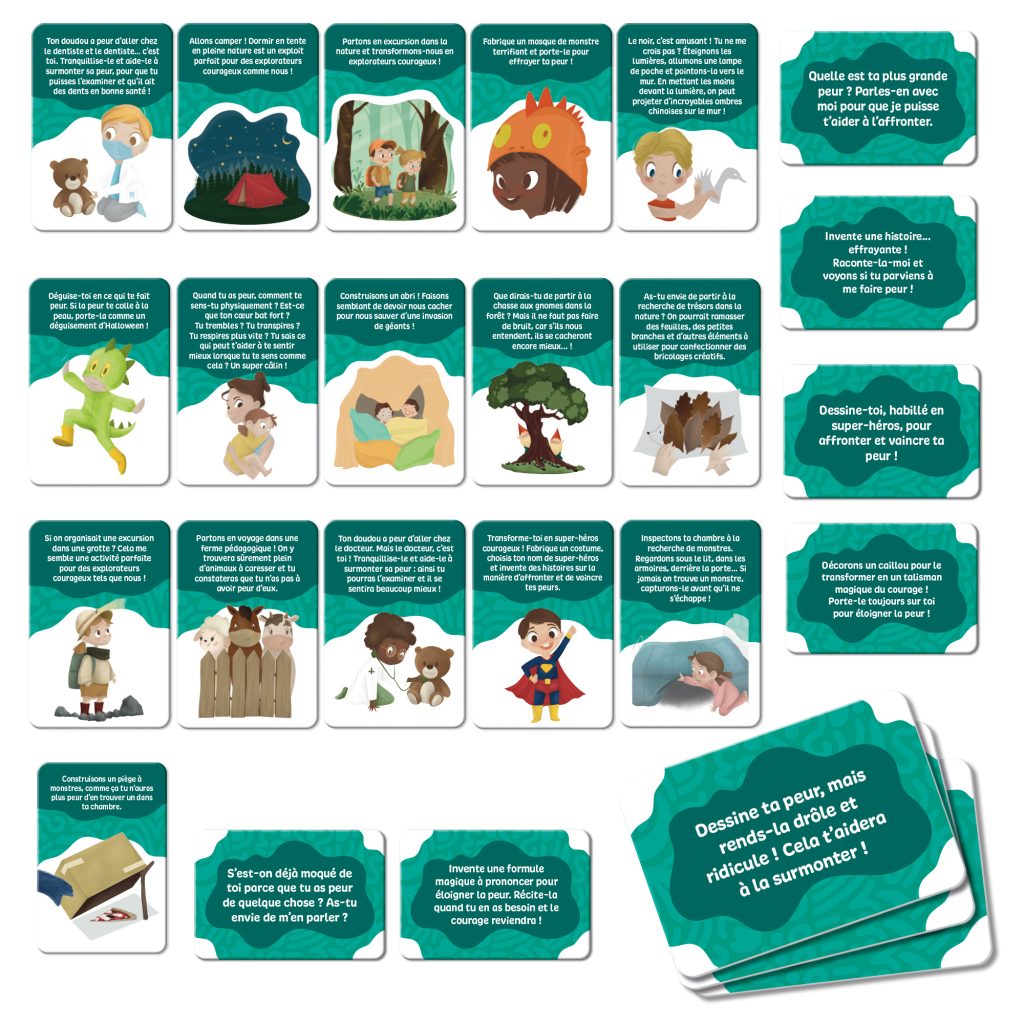 Peur de l’obscurité, peur des monstres, peur du dentiste ou du médecin, peur de l’inconnu… Nos p’tits loups sont souvent en proie à des peurs qui freinent leur confiance en eux… Et ce jeu est parfait pour apprendre à les affronter ! Il se compose de 42 cartes, joliment illustrées, proposant des activités qui permettront à vos enfants de mieux appréhender et ainsi combattre les diverses peurs qui peuvent les perturber. Il suffit de mélanger les cartes, d’en piocher une, de suivre la consigne qui fait le plus souvent appel à l’imagination de nos p’tits loups, et ainsi de suite ! Un jeu parfait pour apprendre à gérer ses émotions de manière ludique ! A partir de 4 ans.