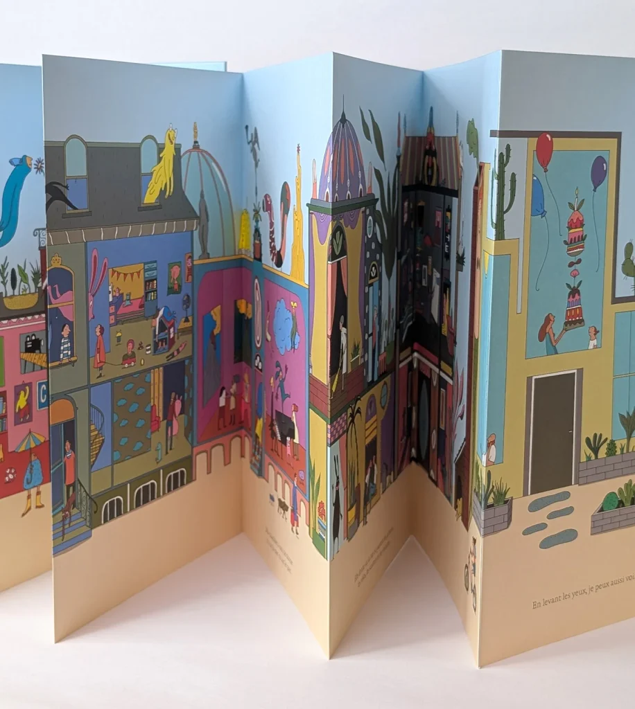 Bienvenue dans la chambre avec vue de ce petit garçon, futur architecte de ses rêves les plus fous, qui invite nos p’tits loups à découvrir son incroyable maison et son environnement tout aussi fantaisiste. Une visite guidée poétique, riche en illustrations délicates et empreintes d’humour, qui ouvre la porte à tous les possibles… Au fil des pages de ce leporello d’une infinie richesse graphique, vos p’tits loups, spectateurs de ce petit monde vaquant à ses occupations quotidiennes, laisseront leur regard s’attarder et inlassablement se perdre dans un luxe de détails qui fait la part belle au rêve. Un livre au concept d’une folle originalité ! A partir de 3 ans.
