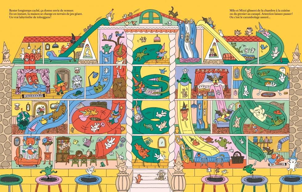 La maison de Milo et Mizzi n’est décidément pas ordinaire… Car celle-ci se transforme au gré des désirs et des émotions de ses deux petits locataires ! Nos deux petits bonhommes ont envie de jouer à cache-cache ? Les pièces se modifient et changent de place. Ils se chamaillent ? La pluie, le tonnerre et les éclairs s’invitent entre ses murs. Ils ont faim ? La maison devient comestible. Ils rêvent de fête foraine et de manèges ? Pas de souci ! Tout plein d’attractions s’installent comme par magie ! Ce bel album invite vos enfants à faire vagabonder leur imagination tout en leur proposant un foisonnant jeu de cherche et trouve… Car ils pourront s’amuser à rechercher les différents personnages dans le fourmillement de ses illustrations ! Un livre interactif qui occupera vos p’tits loups durant des heures ! A partir de 3 ans.