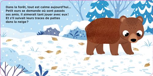 Au coeur de la forêt enneigée, petit ours part à la recherche de ses amis. Et il les découvre bien affairés ! Le faon cueille des feuilles de houx, le lapin récolte des flocons de neige, l’écureuil ramasse des pommes de pin et les oiseaux transportent dans leur bec feuilles et brindilles… Pourquoi une telle frénésie ? Pour décorer le sapin, pardi ! Cet adorable petit album à dévorer des yeux et à explorer du bout des petits doigts présente à vos bébés une jolie histoire de Noël où se cache des textures à toucher (la fourrure de l’ours et celle du faon joliment tachetée, la queue en panache de l’écureuil, le duvet des oiseaux)… Et vous pouvez vous procurer tout plein d’autres titres dans cette belle collection (« Bonjour, bébé ») !